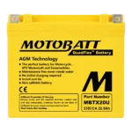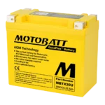 The Motobatt QuadFlex AGM motorcycle battery uses Absorbent Glass Mat (AGM) technology, offering superior cold cranking amps (CCA), a longer service life, and a maintenance-free design. It is considered one of the best motorcycle batteries for performance, reliability, and durability, especially for motorcycles, ATVs, UTVs, and other powersports vehicles.