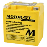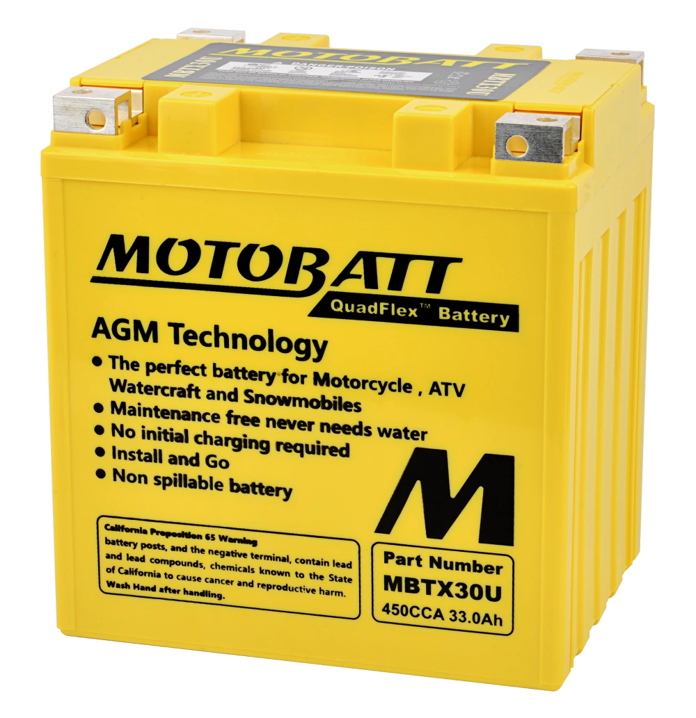 The Motobatt QuadFlex AGM motorcycle battery uses Absorbent Glass Mat (AGM) technology, offering superior cold cranking amps (CCA), a longer service life, and a maintenance-free design. It is considered one of the best motorcycle batteries for performance, reliability, and durability, especially for motorcycles, ATVs, UTVs, and other powersports vehicles.