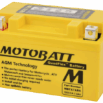 The Motobatt QuadFlex AGM motorcycle battery uses Absorbent Glass Mat (AGM) technology, offering superior cold cranking amps (CCA), a longer service life, and a maintenance-free design. It is considered one of the best motorcycle batteries for performance, reliability, and durability, especially for motorcycles, ATVs, UTVs, and other powersports vehicles.